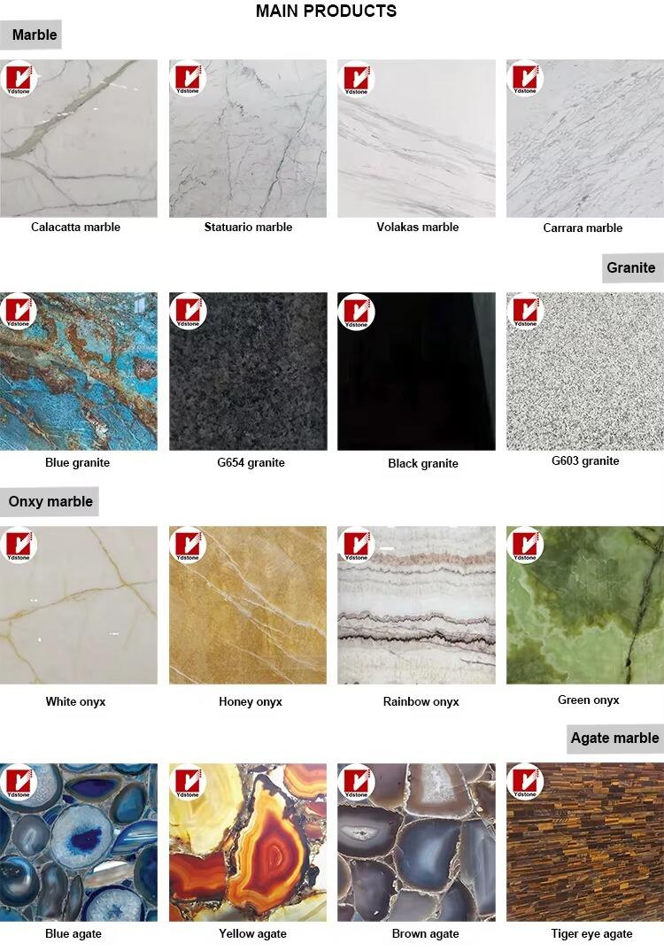 Xiamen Ydstone Co., Ltd est un fournisseur professionnel offrant une solution clé en main pour des projets de construction, particulièrement spécialisé dans des projets complets en pierre, comprenant la conception, la transformation et l'installation. Notre large gamme de produits en pierre est exportée depuis plusieurs années vers de nombreux pays, tels que les pays d'Europe, d'Amérique et du Moyen-Orient. Nous disposons d'une expérience complète dans des projets luxueux tels que les hôtels cinq étoiles, centres commerciaux, yachts privés, villas privées et autres projets exigeants des normes strictes. Nous proposons une gamme complète de produits en pierre incluant des dalles, des carreaux, des formats découpés sur mesure, des mosaïques, des découpes à l'eau, des plans de travail ainsi que d'autres articles personnalisés. Quel que soit l'article dont vous avez besoin pour votre projet, nous ferons de notre mieux pour vous offrir un service de solution unique. Depuis 2001, l'usine Yuanda se concentre sur les marbres naturels, l'onyx, le granite et les pierres reconstituées, etc., et a obtenu les certifications relatives aux normes de gestion de la qualité GB/T 19001-2016/ISO 9001:2015, au système de management environnemental GB/T 24001-2016/ISO 14001:2015 ainsi qu'au système de management de la santé et sécurité au travail GB/T 28001-2011/OHSAS 18001:2007, afin d'assurer des produits de qualité et un excellent service. Elle dispose d'installations plus avancées par rapport à ses concurrents, telles que 9 scies à fil diamanté pour marbre, 5 machines à polir automatiques, 2 lignes de séchage automatiques, permettant de répondre aux demandes diversifiées des clients. Notre équipe professionnelle de design, notre équipe de contrôle qualité et notre équipe technique expérimentée s'investissent pleinement à chaque étape, avec des exigences strictes concernant le choix des matières premières, la production, l'emballage et l'expédition, afin d'assurer la livraison en toute sécurité des produits de qualité sur votre chantier. En outre, notre équipe commerciale professionnelle vous apporte des conseils précieux pour vous aider à finaliser la commande de votre projet complet. Reconnus pour notre qualité raffinée et notre service professionnel, nous entretenons de bonnes relations avec nos clients et jouissons d'un bon marché en Europe, en Amérique, au Moyen-Orient et ailleurs, bénéficiant ainsi d'une large reconnaissance de nos clients. Votre satisfaction est notre objectif principal, nous sommes donc le partenaire idéal que vous recherchez.