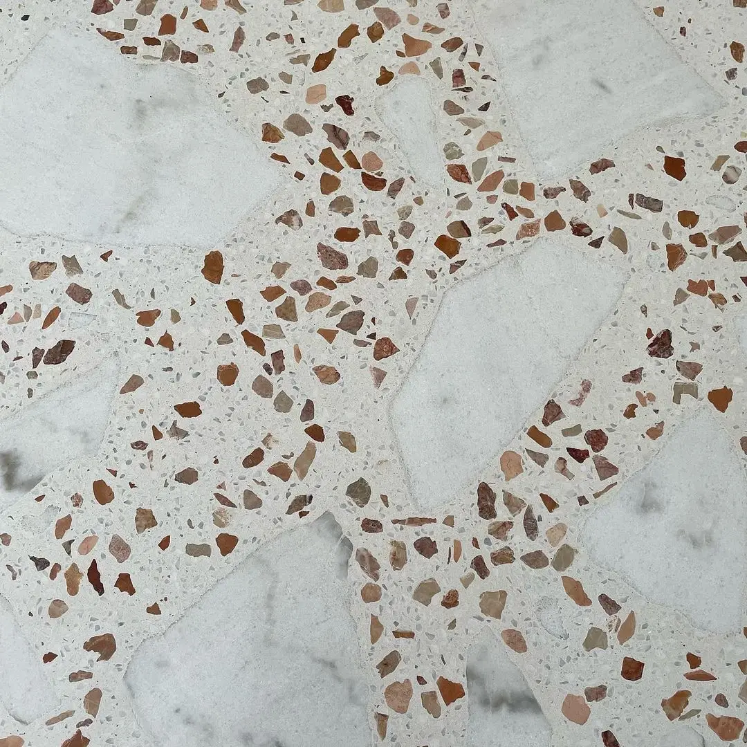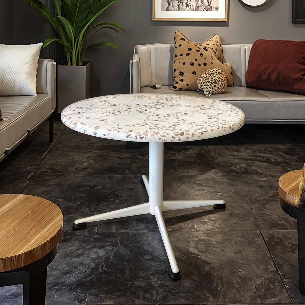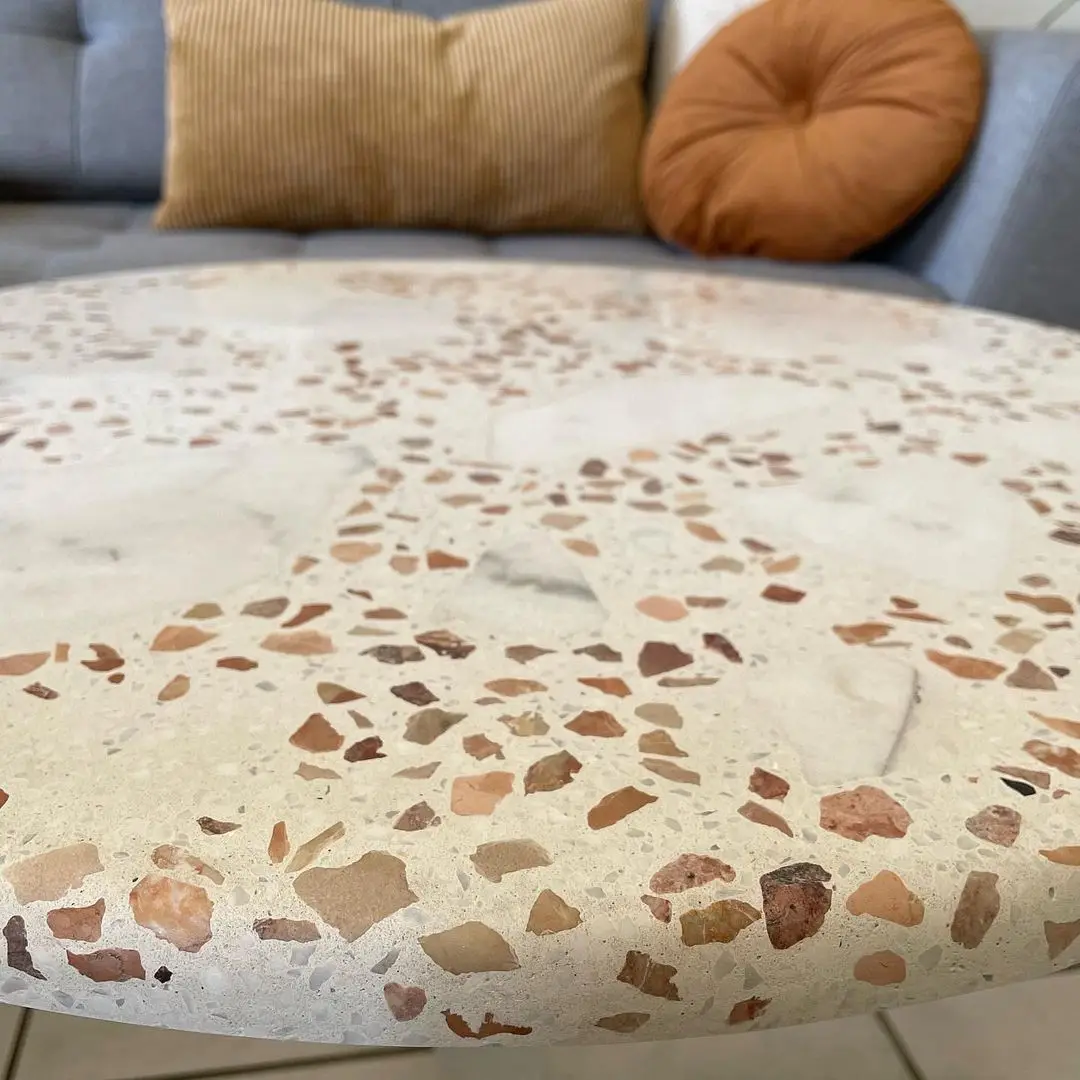 Made from premium terrazzo, this tabletop boasts a stunning round shape that adds a touch of elegance and sophistication to any room. With its sleek and modern design, it seamlessly complements a variety of decor styles, from contemporary to traditional. The terrazzo material is not only durable and long-lasting but also easy to clean and maintain, making it a practical choice for busy households.
